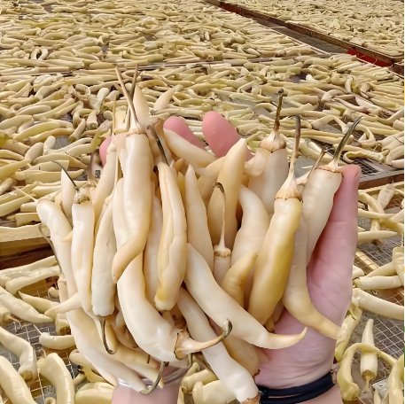 晒制是白辣椒形成独特风味的关键。阳光将辣椒中的水分慢慢蒸发,原本翠绿的颜色逐渐褪去,转变为淡黄至乳白色。